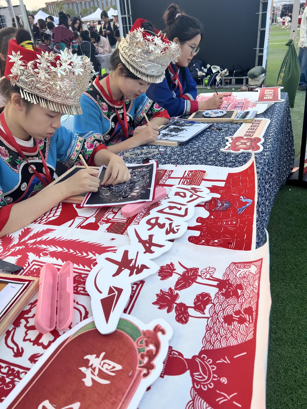 国家级非遗剪纸“踏虎凿花”现场展览,也成为活动的一大亮点。学子们不仅系统展示了这一湘西苗族独有的剪纸技艺的核心流程,还设置了互动体验环节,让观众在亲手参与中感受非遗的魅力。“踏虎凿花”是根植武陵山区的苗族非遗艺术,其承载的家国情怀与汉族剪纸、藏族唐卡一脉相承。这项技艺既体现了中华文化多元一体的特性,更是铸牢中华民族共同体意识的重要文化实践。