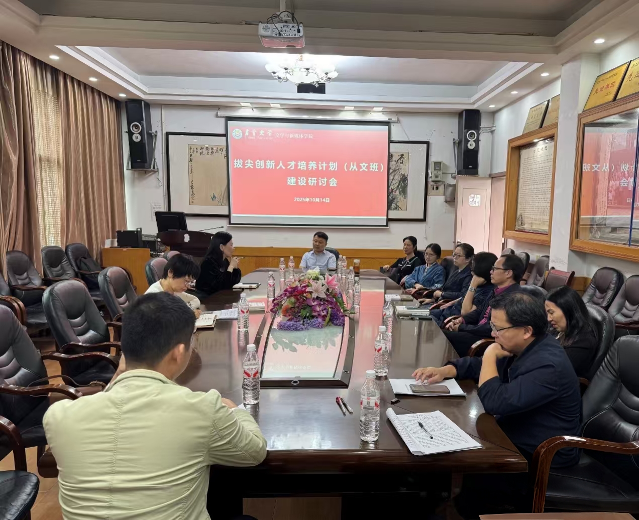 本网讯(通讯员 肖湘怡 汪雅楠)10月14日下午,学院于砂子坳校区影视鉴赏室成功召开“拔尖人才培养计划及从文班建设”研讨会。经理瞿建慧,副经理罗琼,从文班相关责任导师以及辅导员刘建新参加此次会议。
